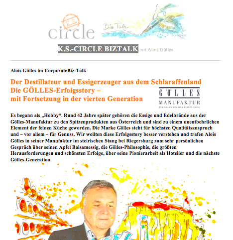 Es begann als „Hobby“. Rund 42 Jahre später gehören die Essige und Edelbrände aus der Gölles-Manufaktur zu den Spitzenprodukten aus Österreich und sind zu einem unentbehrlichen Element der feinen Küche geworden. Die Marke Gölles steht für höchsten Qualitätsanspruch und – vor allem – für Genuss. Wir wollten diese Erfolgsstory besser verstehen und trafen Alois Gölles in seiner Manufaktur im steirischen Stang bei Riegersburg zum sehr persönlichen Gespräch über seinen Apfel Balsamessig, die Gölles-Philosophie, die größten Herausforderungen und schönsten Erfolge, über seine Pionierarbeit als Hotelier und die nächste Gölles-Generation.